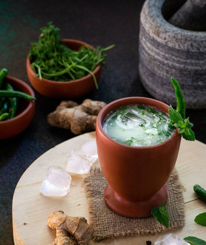 Pudina Chaas is a traditional refreshing drink from Southern India, particularly Tamil Nadu. It's often kept in clay pots, giving it a special aroma.
