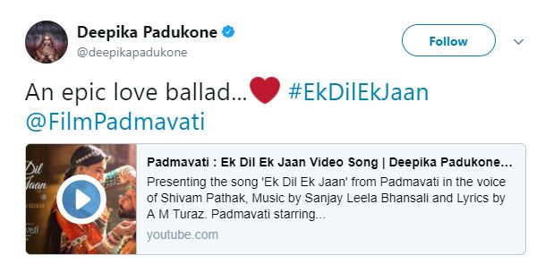 Soon after the release f the song, the 'xXx: Return of Xander Cage' star rook to her Twiiter handle and wrote, "An epic love ballad...?? #EkDilEkJaan @FilmPadmavati"