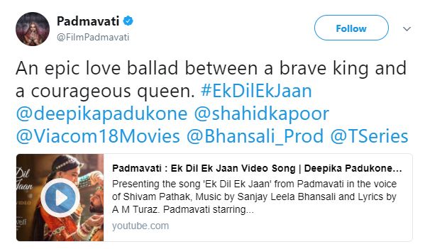 The official handle of 'Padmavati' tweeted, "An epic love ballad between a brave king and a courageous queen. #EkDilEkJaan @deepikapadukone @shahidkapoor @Viacom18Movies @Bhansali_Prod @TSeries"