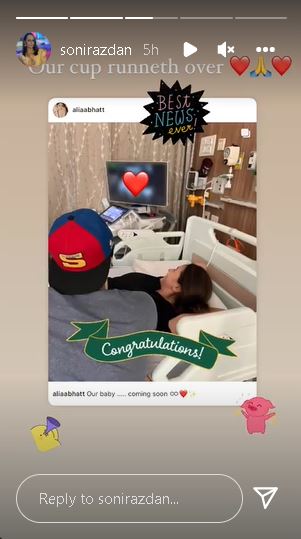 Sharing Alia's post to her Instagram story, the nani-to-be wrote, "Our cup runneth over" along with heart emoticons.
