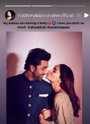 Reacting to the couple's pregnancy news, Ranbir's sister Riddhima Kapoor Sahni posted an adorable post on her Instagram Story.
