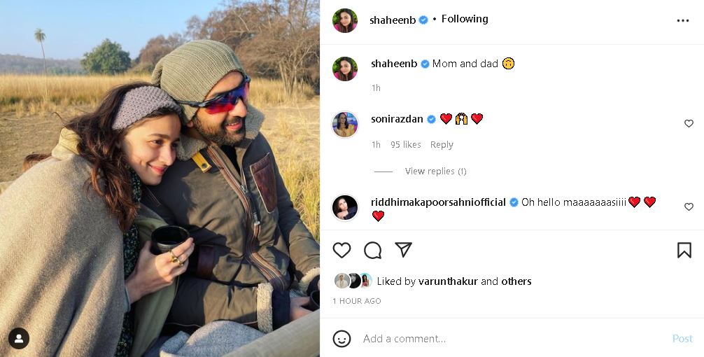In the picture, Alia is seen leaning on Ranbir who sat beside her. This picture seems to have been taken during their Ranthambore trip. Sharing this pic, Shaheen wrote, "Mom and dad" with a smiley.