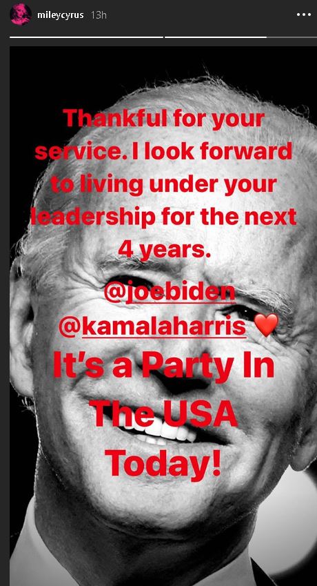American singer Miley Cyrus also shared her excitement with a reference to one of her past hits, 'It's a Party In The USA today!'