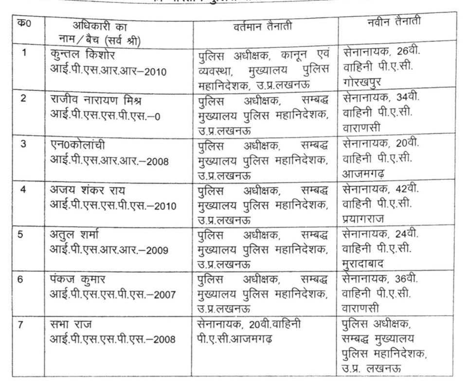 The list of IPS officers who were transferred includes the names of Kuntal Kishore, Rajiv Narayan Mishra, N Kolanchi, Ajay Shankar Rai, Atul Sharma, Pankaj Kumar, and Sabha Raj.