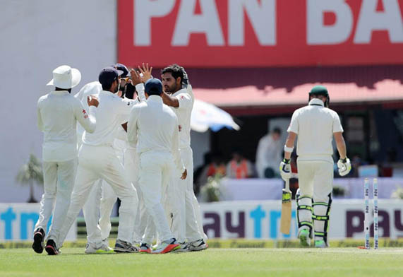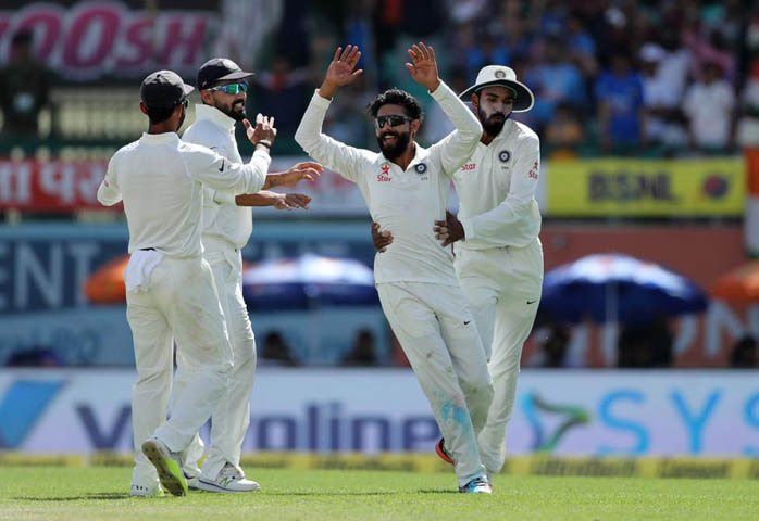 Australia: 300 and 137 all out in 53.5 overs (Glenn Maxwell 45, Matthew Wade 25 not out; R Jadeja 3/24, Umesh Yadav 3/29, R Ashwin 3/29).