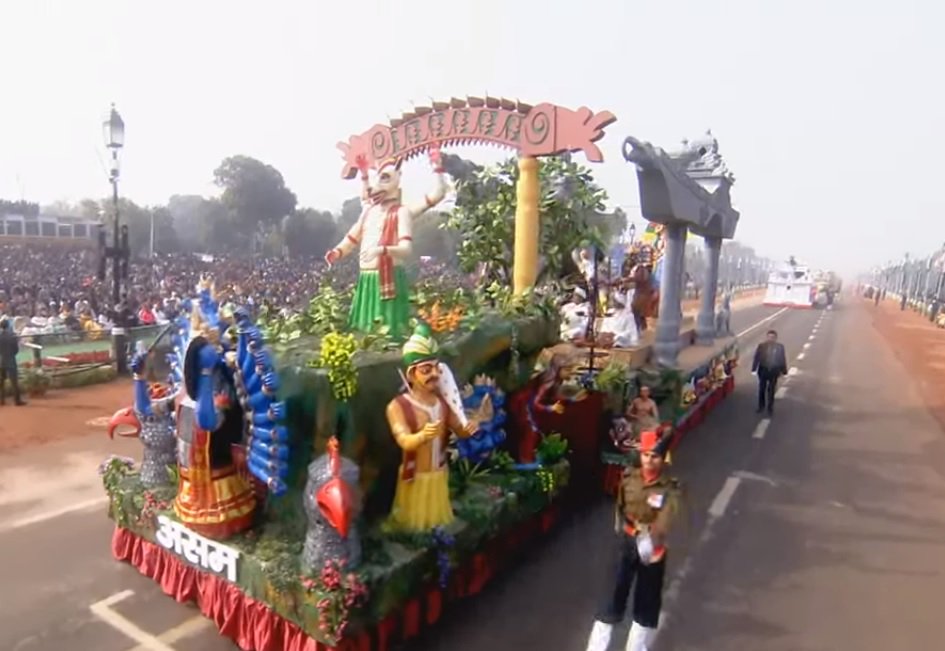 Manipur tableau narrated the tale of Khamba and Thoibi - a story of youthful love while Assam tableau reflected the traditional masks of the Satras .
