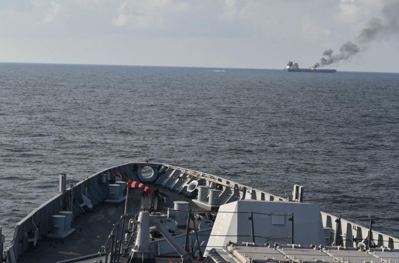 Based on the request from the MV Merlin Luanda, INS Visakhapatnam has deployed the Ship's NBCD team along with firefighting equipment to provide assistance to the crew towards augmenting firefighting efforts onboard the distressed MV Merlin Luanda, according to the Indian Navy.