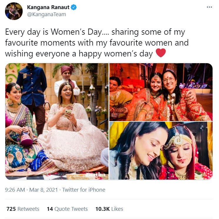 The 'Queen' of Bollywood, Kangana Ranaut paid respect to the women in her life by tweeting photos of them, along with the message, "Every day is Women's Day.... sharing some of my favourite moments with my favourite women and wishing everyone a happy women's day," followed by a heart emoji.