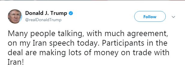 "Many people talking, with much agreement, on my Iran speech today. Participants in the deal are making lots of money on trade with Iran!" President Trump tweeted.