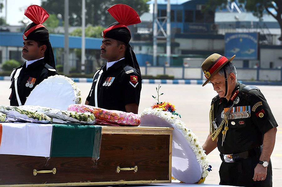 Army Chief General Bipin Rawat on Sunday paid homage to the two soldiers who lost their lives in an attack by terrorists in Qazigund district