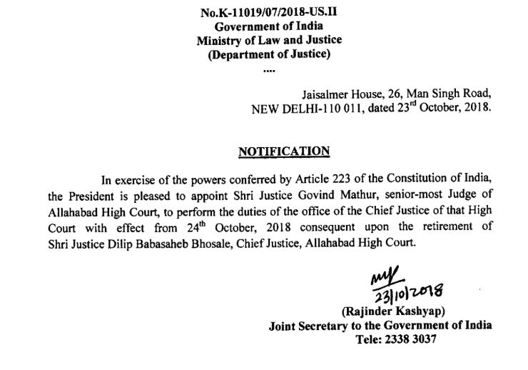 New Delhi: Justice Govind Mathur has been appointed as the Acting Chief Justice of Allahabad High Court on Tuesday.
