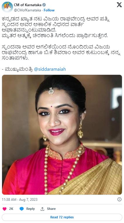 "The demise of Spandana, the wife of popular Kannada actor Vijaya Raghavendra has shocked me. I pray for her soul. I condole with the bereaved families of Vijay Raghavendra and B.K. Shivaram," Siddaramaiah tweeted in Kannada.