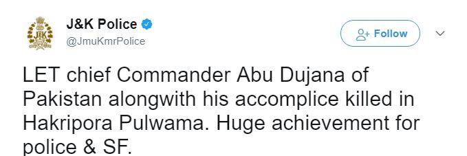 Confirming the news, the Jammu and Kashmir Police Twitter handle said, "LET chief commander Abu Dujana of Pakistan alongwith his accomplice killed in Hakripora Pulwama. Huge achievement for police & SF."