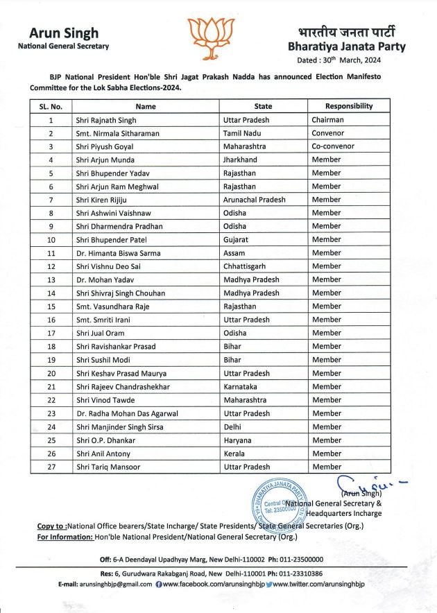 Union ministers Dharmendra Pradhan, Ashwini Vaishnaw, Smriti Irani, Rajeev Chandrashekhar, Kiren Rijiju and Arjun Munda, among others, will be members of the 27-member election manifesto committee.