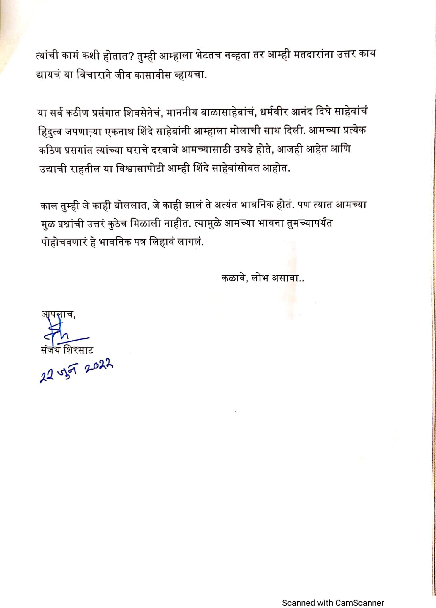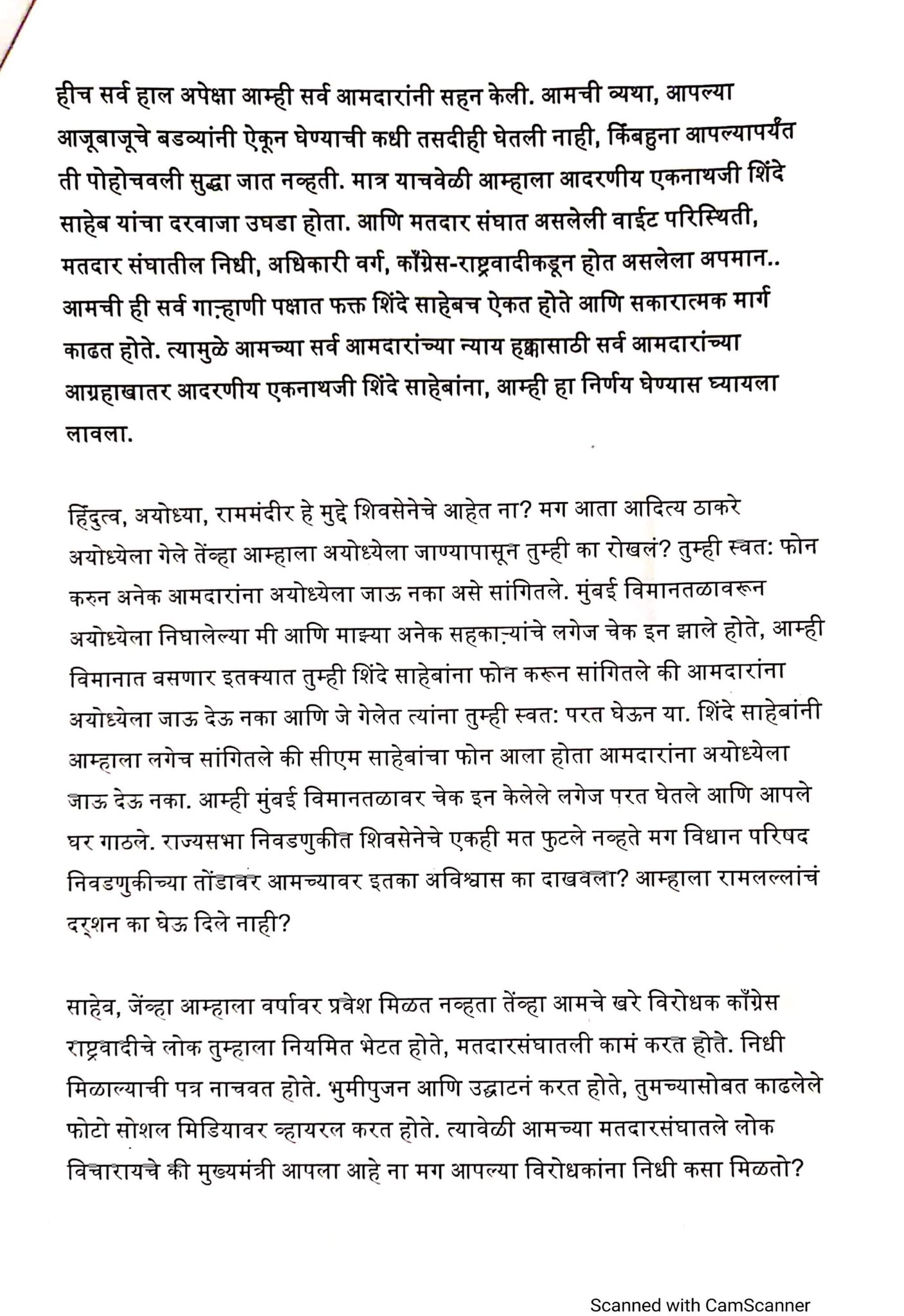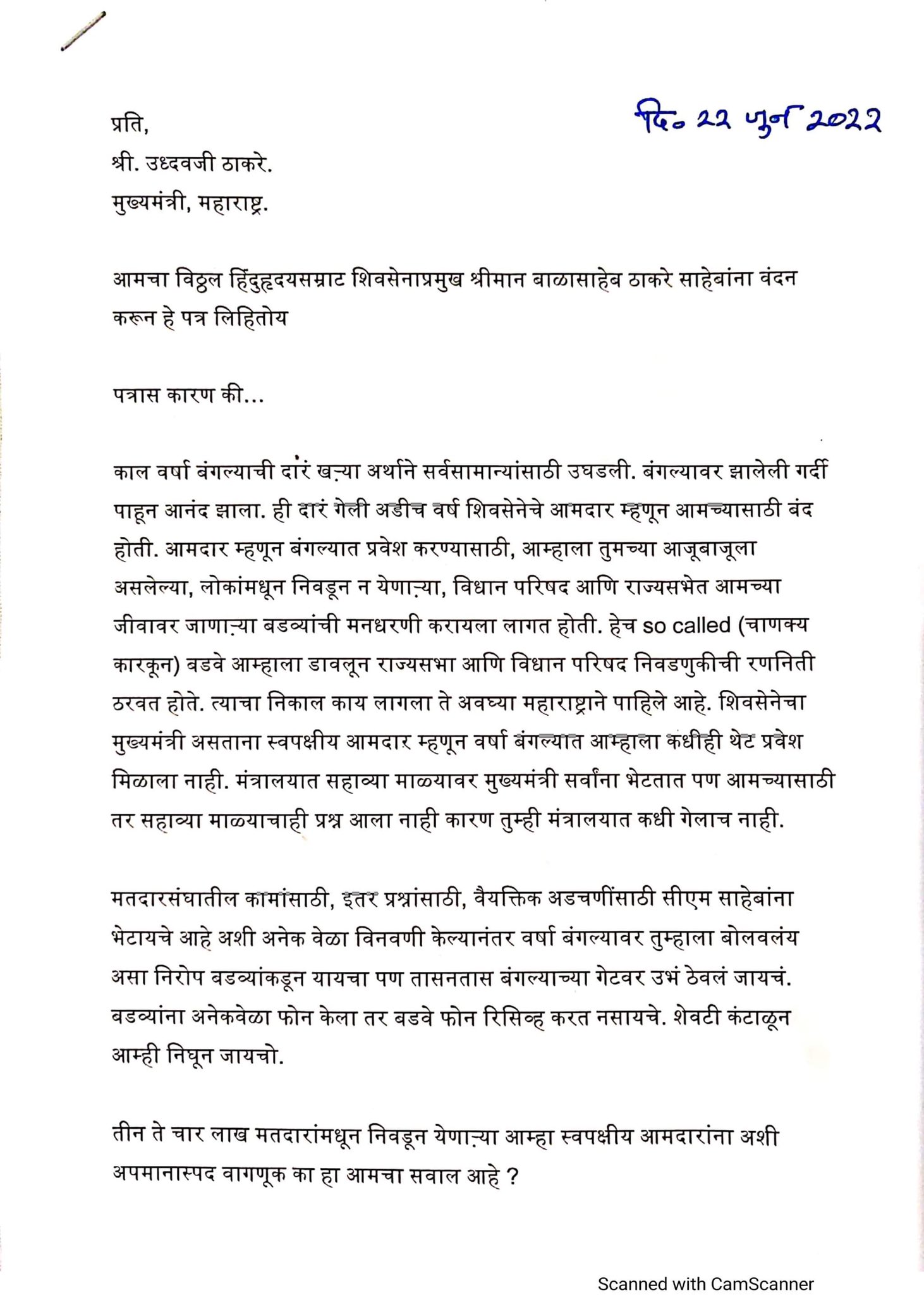 Mumbai: As the crisis in the State politics, caused by a rebellion by Shiv Sena leader Eknath Shinde, is deepening with every passing minute, a three-page letter has been shot on Thursday to the Chief Minister Uddhav Thackeray by the rebel group expressing their resentment against Thackeray.