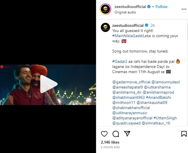 Taking to Instagram, Production house Zee Studios shared a teaser of the song which they captioned, “You all guessed it right! #MainNiklaGaddiLeke is coming your way. Song out tomorrow, stay tuned. #Gadar2 aa rahi hai bade parde par lagane iss Independence Day! Cinemas mein 11th August se.”