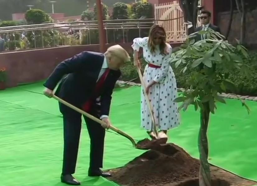 Donald Trump sported his signature red tie for the day along with his staple black suit and the unmissable broach of the American flag on the left lapel. The President received a ceremonial welcome at the Rashtrapati Bhavan on Tuesday and later visited the Rajghat along with First Lady Melania.