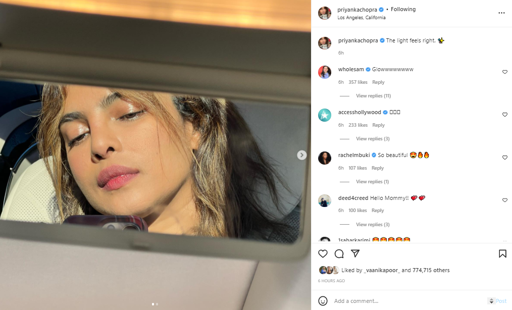 Global star and new mom Priyanka Chopra is acing her carfie game as seen from her latest social media post.
