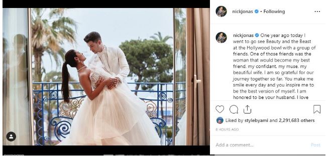 "One year ago today I went to go see Beauty and the Beast at the Hollywood bowl with a group of friends. One of those friends was the woman that would become my best friend, my confidant, my muse, my beautiful wife. I am so grateful for our journey together so far. You make me smile every day and you inspire me to be the best version of myself. I am honoured to be your husband. I love you. @Priyanka Chopra," he wrote.