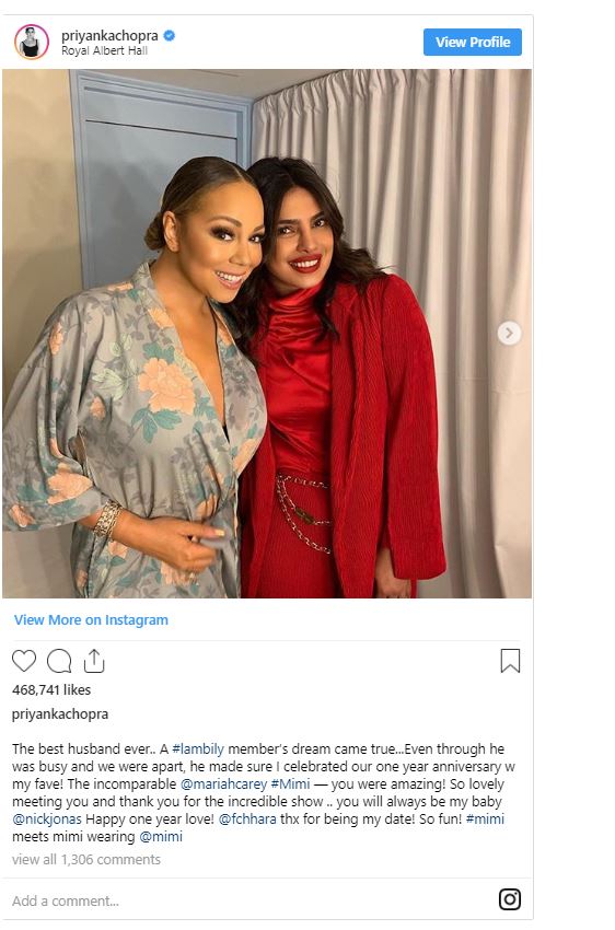 "The best husband ever.. A #lambily member's dream came true...Even though he was busy and we were apart, he made sure I celebrated our one year anniversary w my fave!" she wrote. "The incomparable Mariah Carey, Mimi -- you were amazing! So lovely meeting you and thank you for the incredible show .. you will always be my baby Nick Jonas Happy one year love!"