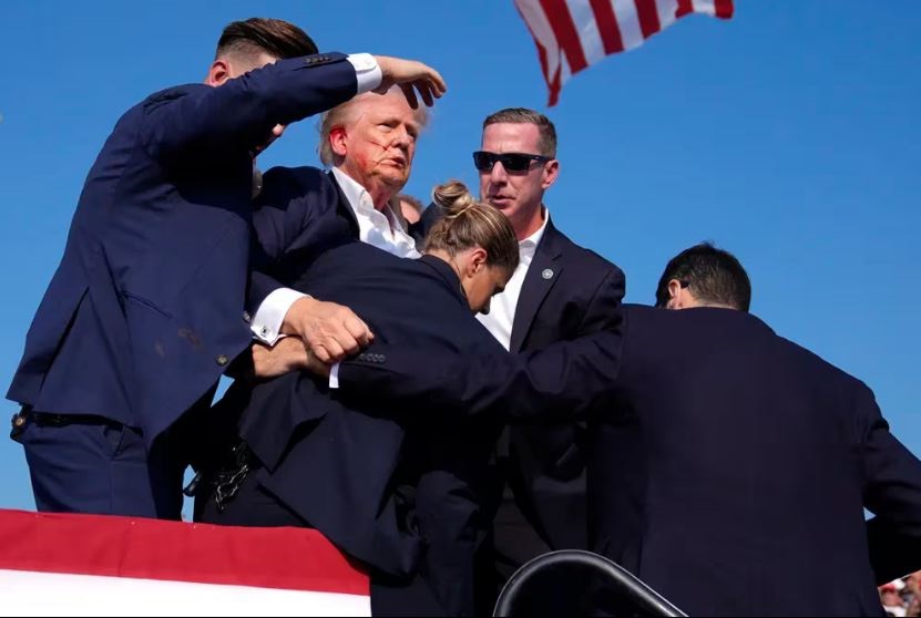The Secret Service agents surrounded the Republican candidate and escorted him off the stage, with blood visible across his face. He raised his fist towards the crowd as he was escorted away by law enforcement personnel.