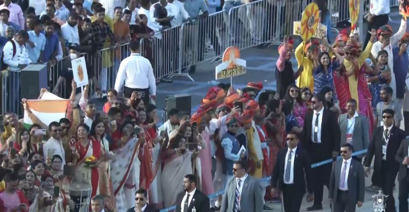 He was welcomed by BAPS' Ishwarcharandas Swami and garlanded by a group of priests upon his arrival. People gathered for the occasion also raised "Modi, Modi" slogans and he waved towards them.