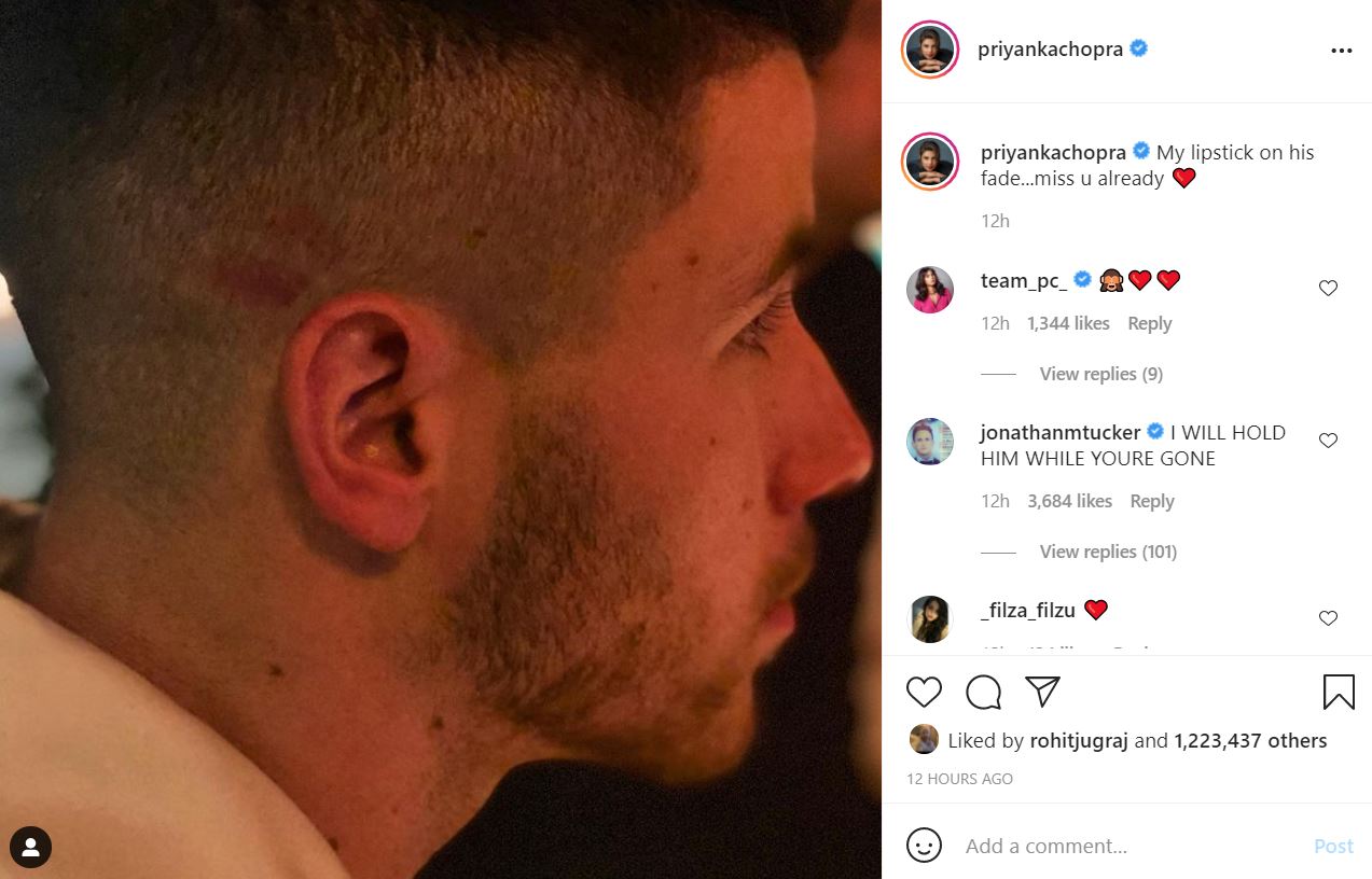 'The White Tiger' actor took to her Instagram handle and shared a picture of Nick where her lipstick mark could be seen on his head. Along with the picture, she wrote, "My lipstick on his fade...miss u already", followed by a heart emoji.