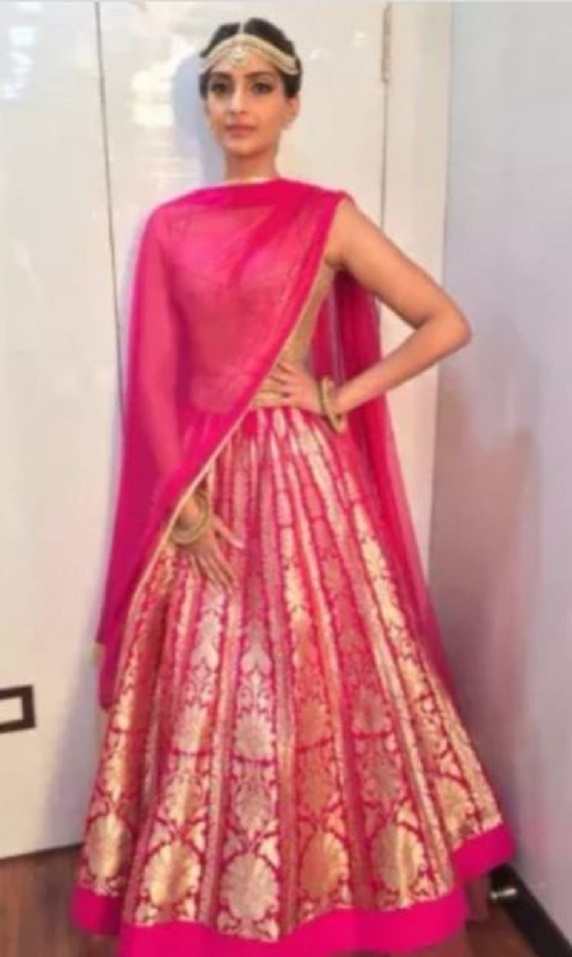 4. When talking about dressing to the nines, it's hard to not mention Sonam Kapoor- the fashionista, who is always setting major fashion goals for her fans. Just like her you can also sport a simple lehenga choli and let a heavy jewellery set do the talking! You can team up the outfit with matching high heels. Choose retro-styled curls with smokey makeup to look your festive best.