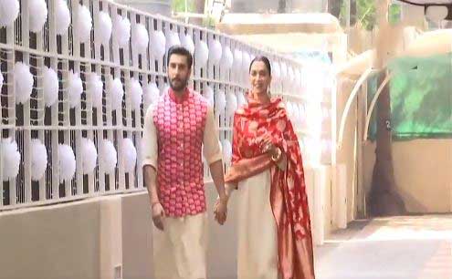 Ranveer wore a cream kurta, paired with white churidar topped with a contrasting red sleeveless jacket adorned with golden motifs. Similarly, Deepika's opted for a knee-length kurta in cream colour, with a white churidar and added a dash of colour with a heavy banarsi dupatta in red, teamed with heavy golden jhumkis.