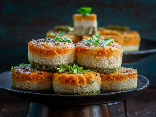 Then add a third layer and steam. Dhokla will be done in 15 minutes. Remove from heat and cool. Cut into desired shapes and plate it. Heat oil in a small saucepan and make the tempering of seasoning ingredients. Pour the seasoning over Tiranga dhokla and garnish with grated coconut and chopped coriander.