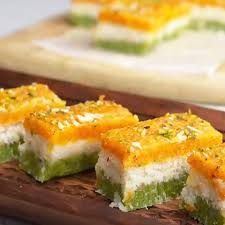 Method: Soak cashews and almonds separately for half an hour, then drain and peel almonds. Put the nuts in a mixer grinder to form a thick paste. Add milk and sugar and grind again. Split the paste into three separate bowls post which mix the red colour to the first part.