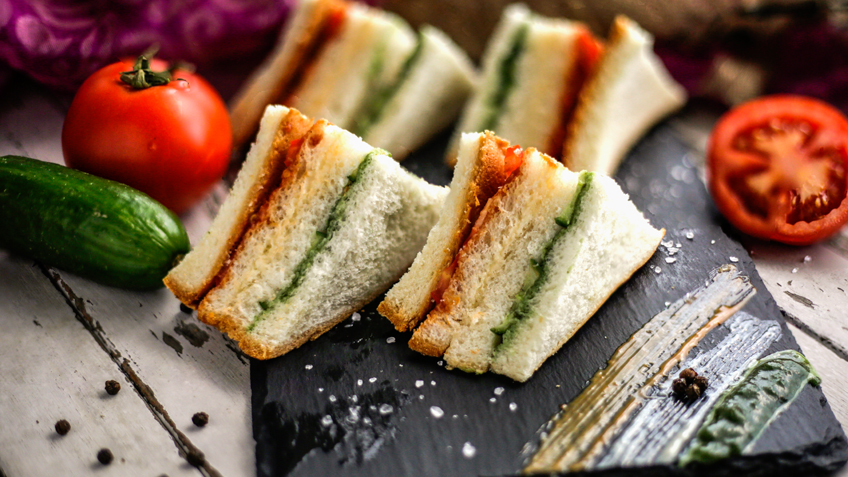 Method: Chopped orange tomato and set it aside. Butter the bread slices and set them aside. For the green layer, mix mint chutney, paneer, and salt in a bowl well and set aside. For the orange layer, mix tomato, mayonnaise, and salt in a separate bowl well and set aside.