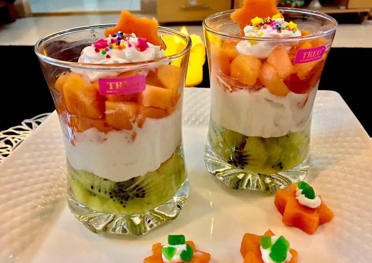 Take a tall glass and add kiwi at the bottom and add in a scoop of softly whipped cream, or vanilla ice cream. Add vanilla ice cream, on top, put orange fruits again. Garnish with nuts and top it with a cherry or mint. Serve immediately.