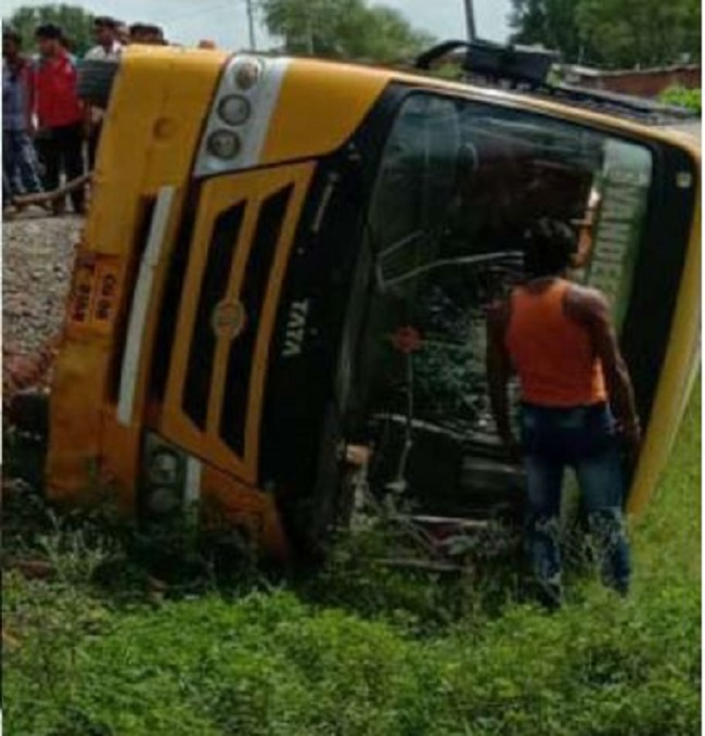 A speeding truck rammed into a bus belonging to Sai Inter College while overtaking, due to which the bus overturned on a roadside, he said.