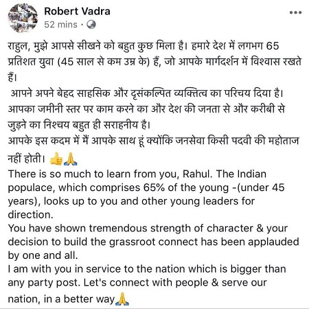 The statement from Vadra came just days after Rahul Gandhi had put a letter on Twitter making his resignation public and empowering the Congress Working Committee (CWC) to choose his successor.