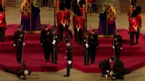 As seen in the video, three other guards came to his rescue and helped him get emergency aid. The guard's collapse comes as hundreds of thousands of mourners thronged the streets of London to pay homage to the late Queen.