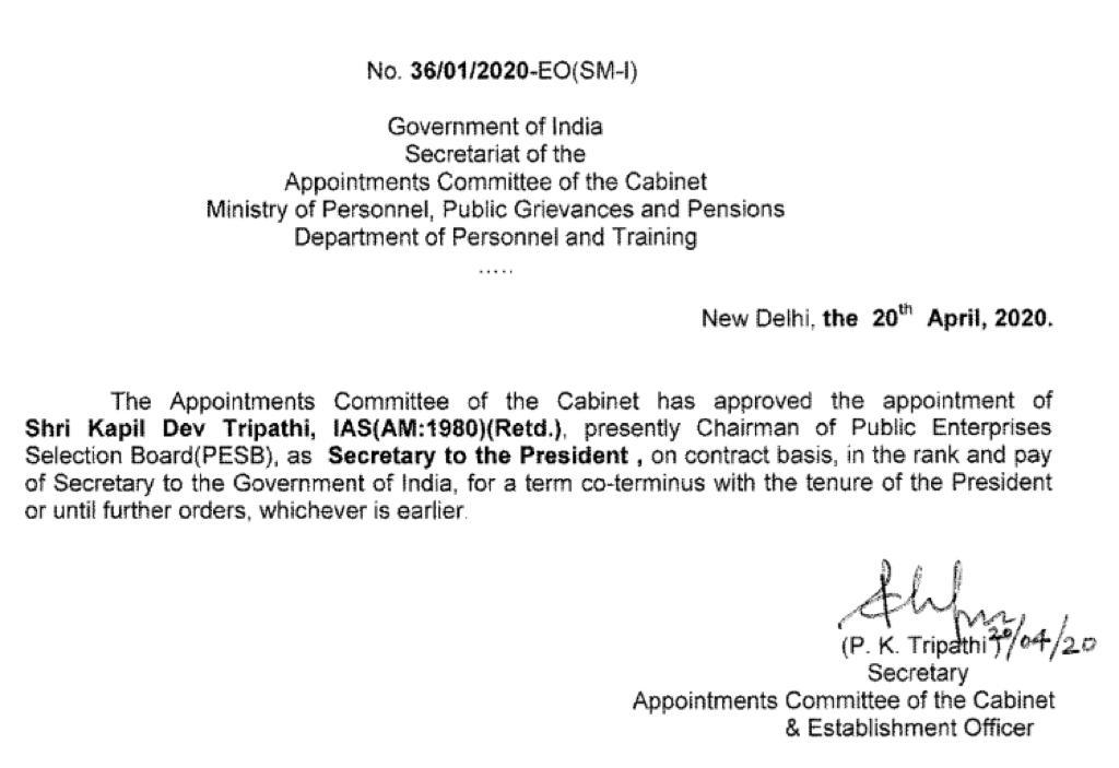 The Appointments Committee of the Cabinet headed by Prime Minister Narendra Modi has appointed Tripathi as Secretary to Kovind on contract basis, for a term co-terminus with the tenure of the President, it said.