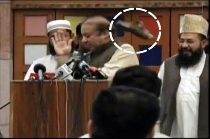 A miscreant hurled a shoe at Sharif when he was about to address a gathering at the Jamia Naeemia mosque in Lahore on Sunday.