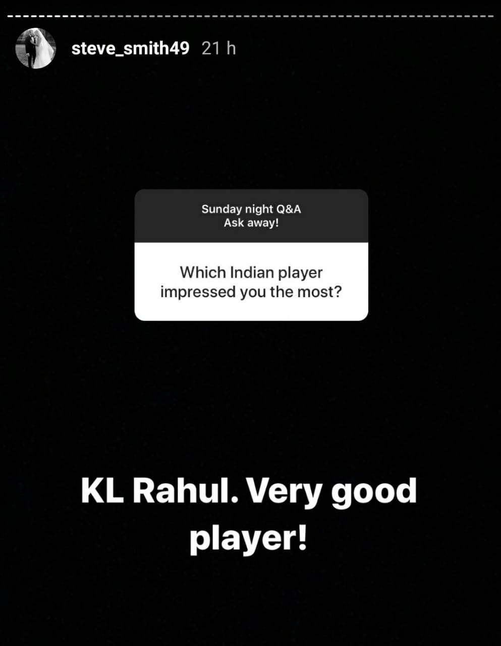 When asked about which Indian player impressed him the most, Smith replied: KL Rahul. Very good player!"