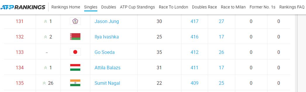 New Delhi: With a big jump of 26 places, Indian tennis star Sumit Nagal on Monday achieved his career-best ranking after moving up to the 135th position in the latest ATP rankings.