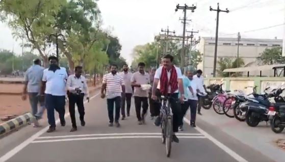 Tamil Nadu: DMK candidate from Thanjavur parliamentary constituency S Murasoli sought votes by cycling in the Thanjavur city area.