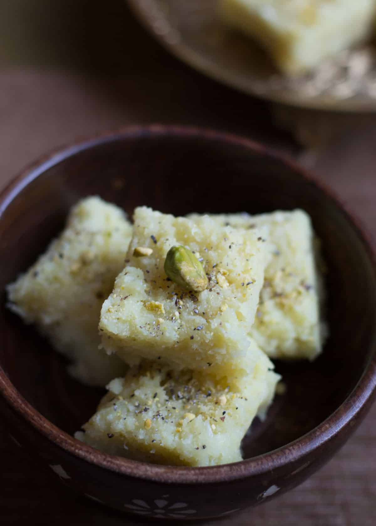 6. Instant coconut barfi- In a heated pan, add desiccated coconut. Keeping the flame on low-medium, stir continuously and cook for 1 minute. Add lukewarm milk and soak saffron strand to it. Add powdered sugar to the roasted coconut, the saffron soaked milk, 1/2 powder milk powder, 2 tablespoons of fresh cream, and mix well.