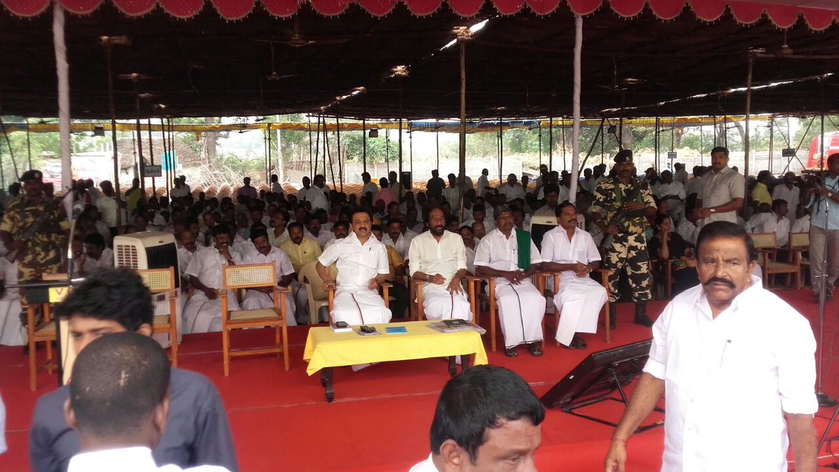 DMK’s working president M.K.Stalin is leading the strike, as he had earlier announced that his party will launch a state-wide hunger strike.