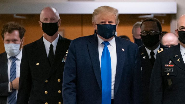 As he left the White House, he told reporters: When you're in a hospital, especially ... I think it's a great thing to wear a mask." Trump was wearing a mask in Walter Reed's hallway as he began his visit. He was not wearing one when he stepped off the helicopter at the facility.
