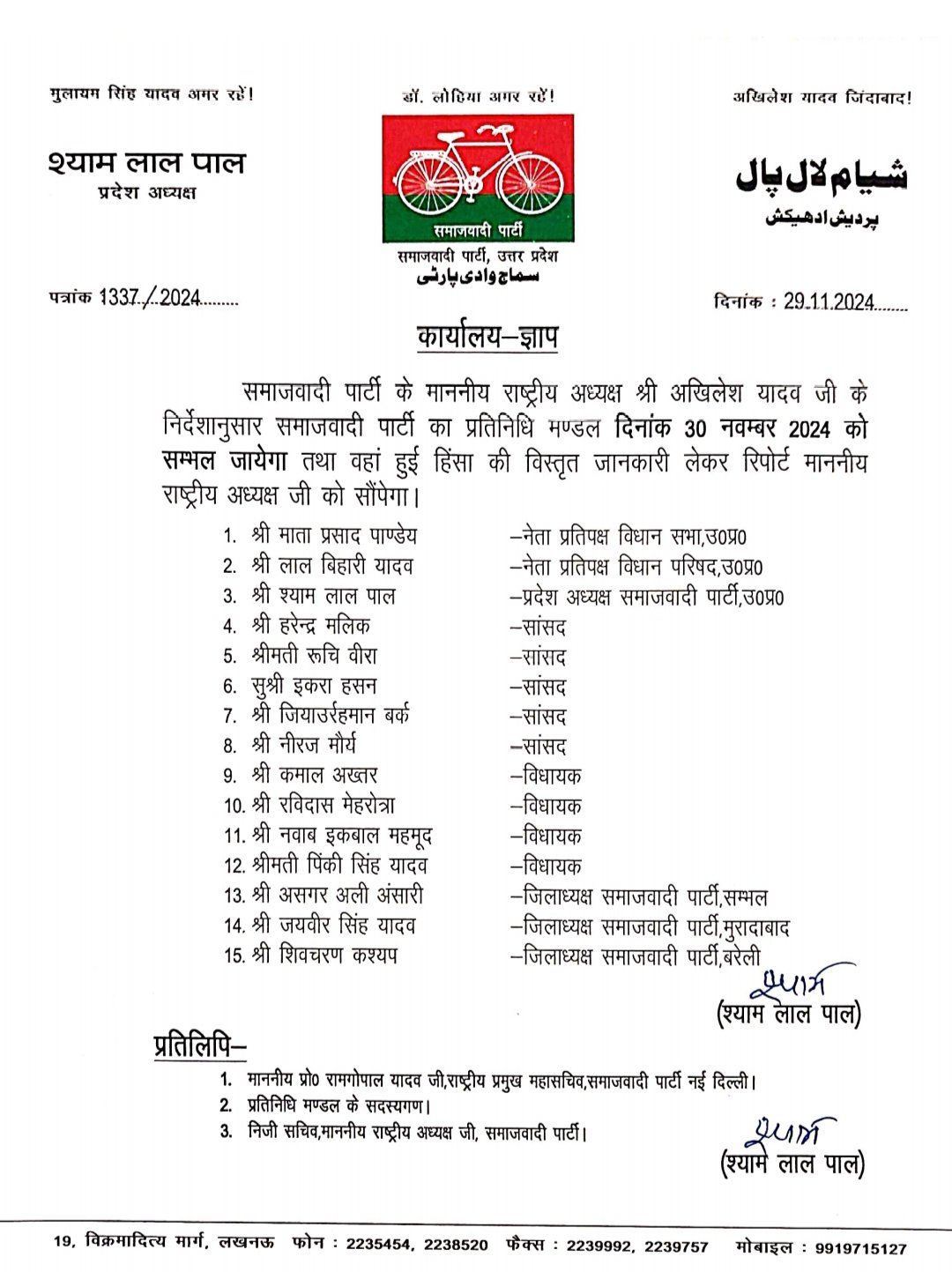 Lucknow: A 15-member delegation of the Samajwadi Party will visit Sambhal to gather information about the violence in which five people were killed, the party said on Friday.