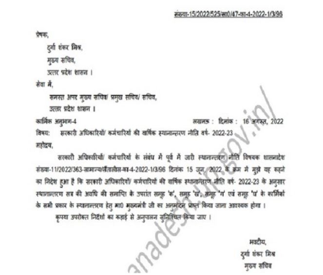 An official notification has been issued by the Chief Secretary Durga Shankar Mishra regarding the new transfer policy. The notification said that after the end of the posting period, the approval of the Chief Minister would be necessary for transfer of all Group A to D employees and officers.