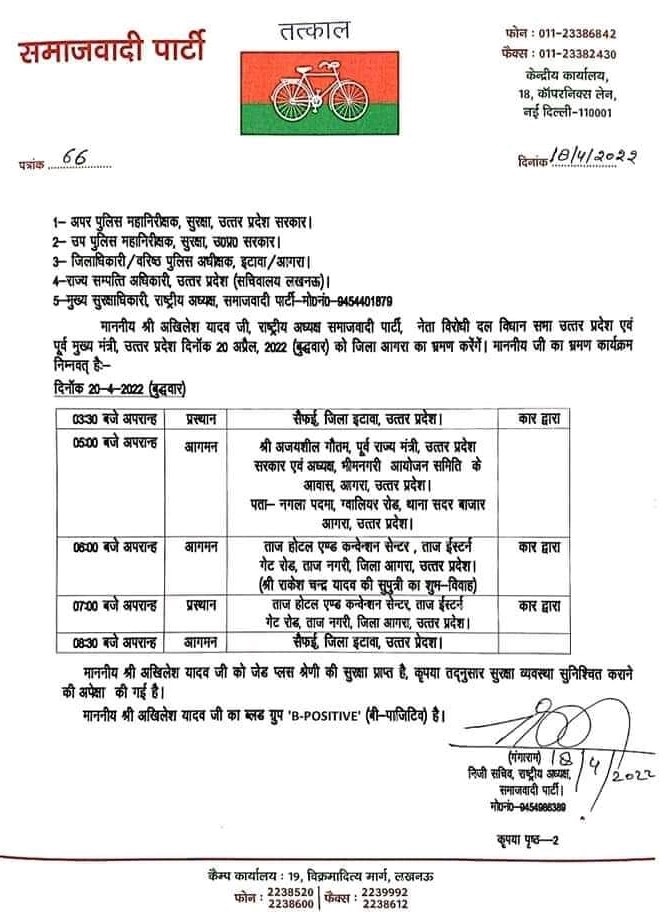 In Agra the SP Chief is likely to participate in other programmes also. At about 7, Akhilesh will leave Agra for Saifai.