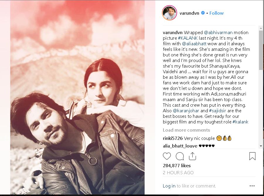 She wrote, "And it's a film wrap for Varun on KALANK.. Our 4th film completed together and he still manages to surprise me with his hard work and crazy energy everyday.. Also manages to make me laugh like a crazy person by just being himself.."