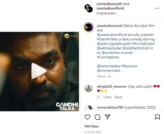 Relive the silent film era!@zeestudiosofficial proudly presents #GandhiTalks, a dark comedy starring @actorvijaysethupathi #ArvindSwami @aditiraohydari @siddharth23oct in an @arrahman musical. #ComingSoon."