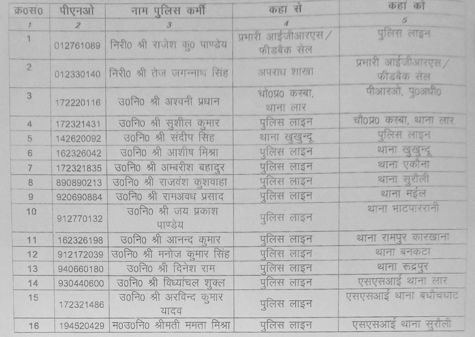 Deoria: In a major reshuffle in the Police department in Deoria, Superintendent of Police (SP) Sanjeev Suman has transferred as many as 22 officials including 16 sub-inspectors and 6 Policemen. The newly appointed CO Satyendra Kumar Rai has been given the responsibility of the traffic department, reports Dynamite News correspondent.